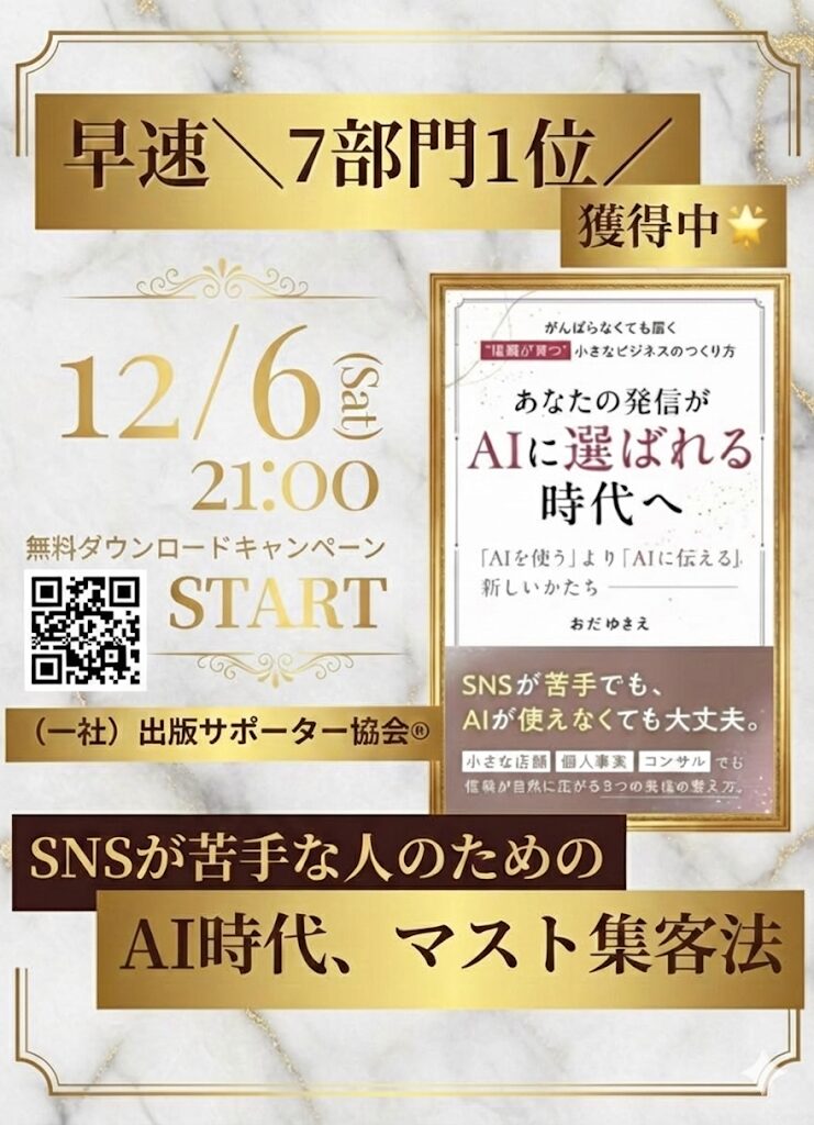 そんな悩みを少しでも軽くできればと思い、小さな事業者の悩みに寄り添いながら、AI時代に必要な伝わる情報の整え方となるAI時代の発信の基本を、「発信をがんばらなくても届く形」でまとめた本書を制作しました。